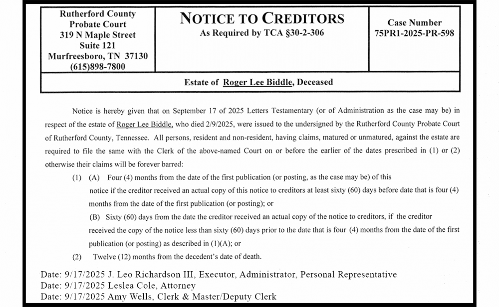 Notice is hereby given that on September 17 of 2025 Letters Testamentary (or of Administration as the case may be) in respect of the estate of Roger Lee Biddle, who died 2/9/2025, were issued to the undersigned by the Rutherford County Probate Court of Rutherford County, Tennessee. All persons, resident and non-resident, having claims, matured or unmatured, against the estate are required to file the same with the Clerk of the above-named Court on or before the earlier of the dates prescribed in (1) or (2) otherwise their claims will be forever barred: