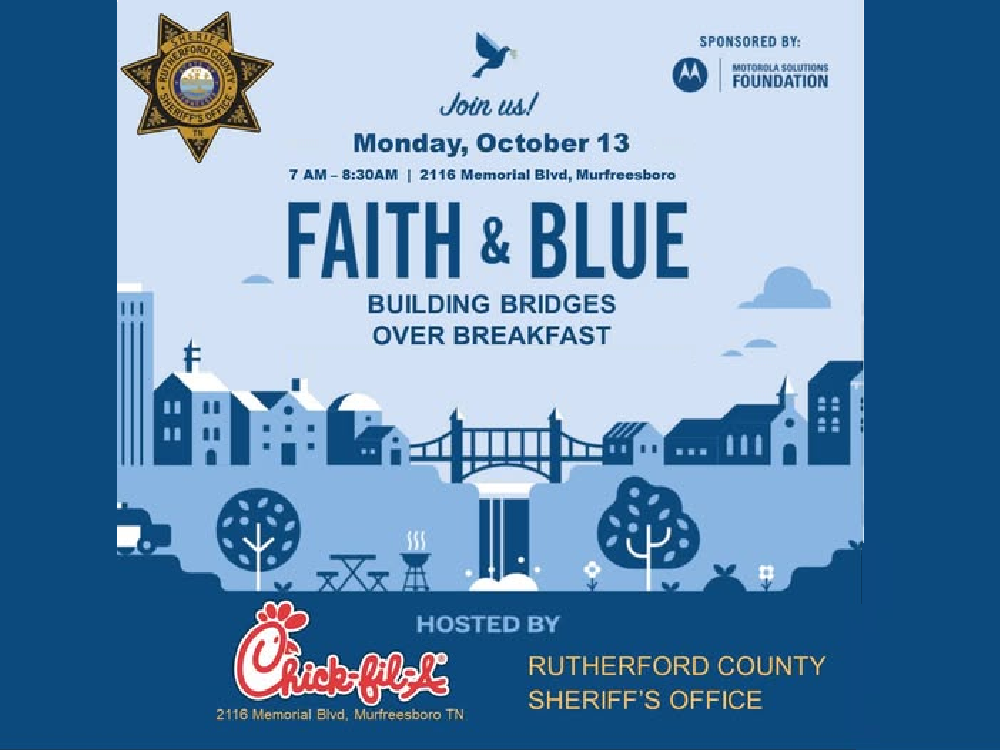 Mon. (Oct. 13, 2025) 7:00-8:3AM Faith and Blue breakfast at Chick-fil-A, 2116 Memorial Blvd., Murfreesboro. The Faith and Blue event is a chance for community residents, faith leaders and law enforcement officers to converse over coffee and continue Building Bridges over Breakfast. Community residents are invited. This event is part of the National Faith & Blue Weekend designed to build safer, stronger and inclusive communities through faith-based organizations.