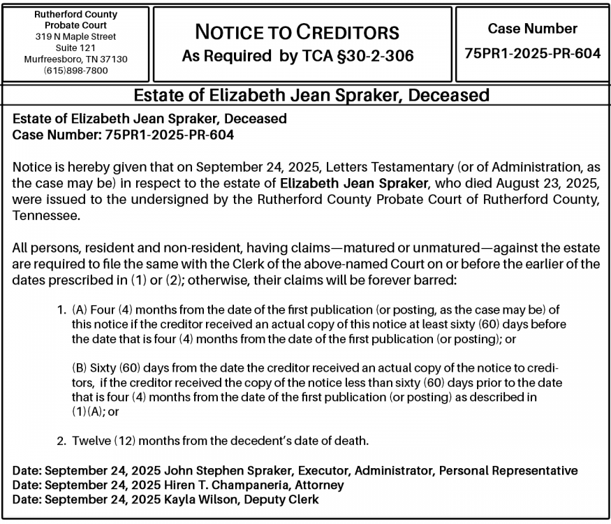 Notice is hereby given that on September 24, 2025, Letters Testamentary (or of Administration, as the case may be) in respect to the estate of Elizabeth Jean Spraker, who died August 23, 2025, were issued to the undersigned by the Rutherford County Probate Court of Rutherford County, Tennessee.