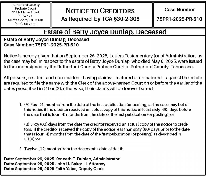 Notice is hereby given that on September 26, 2025, Letters Testamentary (or of Administration, as the case may be) in respect to the estate of Betty Joyce Dunlap, who died May 6, 2025, were issued to the undersigned by the Rutherford County Probate Court of Rutherford County, Tennessee.