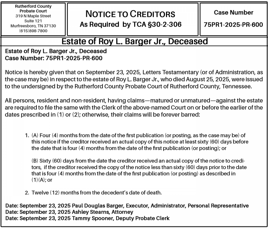 Notice is hereby given that on September 23, 2025, Letters Testamentary (or of Administration, as the case may be) in respect to the estate of Roy L. Barger Jr., who died August 25, 2025, were issued to the undersigned by the Rutherford County Probate Court of Rutherford County, Tennessee.