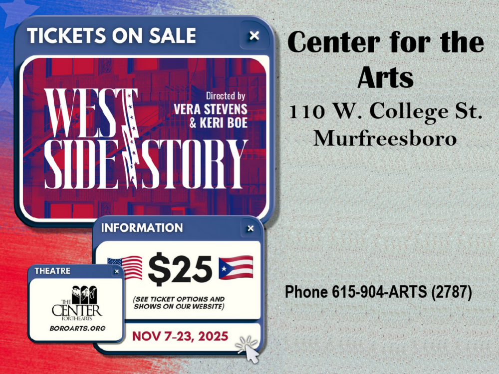 Fri. 7:30PM, Sat. 2PM and 7PM, Sun. 2PM (Nov. 7-23, 2025) "West Side Story" at the Center for the Arts, 110 W. College St., Murfreesboro. "West Side Story” is a powerful musical that reimagines Shakespeare’s Romeo and Juliet in 1950s New York City, swapping feuding families for rival street gangs—the white American Jets and the Puerto Rican Sharks. It portrays both the hope and heartbreak of young love caught in the crossfire of cultural conflict. For more information visit their website http://boroarts.org or phone (615) 904-ARTS (2787).