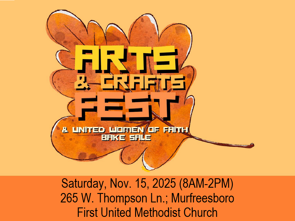 Sat. (Nov. 15, 2025) 8AM-2PM ARTS & CRAFTS BAKE SALE at First United Methodist Church (265 W. Thompson Ln., Murfreesboro). Vendors are welcome. Contact Mary Gammon at mg2245@dtccom.net.