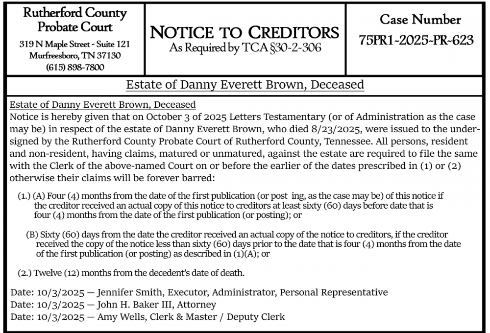 Notice is hereby given that on October 3 of 2025 Letters Testamentary (or of Administration as the case may be) in respect of the estate of Danny Everett Brown, who died 8/23/2025, were issued to the undersigned by the Rutherford County Probate Court of Rutherford County, Tennessee. All persons, resident and non-resident, having claims, matured or unmatured, against the estate are required to file the same with the Clerk of the above-named Court on or before the earlier of the dates prescribed in (1) or (2) otherwise their claims will be forever barred: