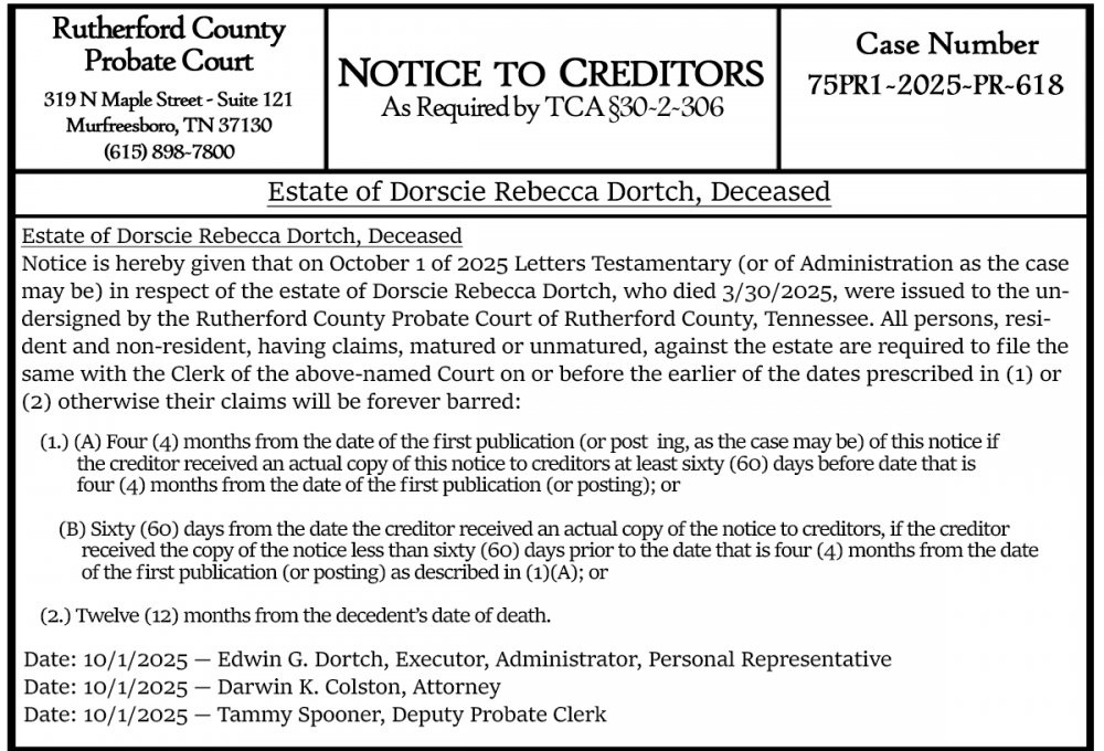 Notice is hereby given that on October 1 of 2025 Letters Testamentary (or of Administration as the case may be) in respect of the estate of Dorscie Rebecca Dortch, who died 3/30/2025, were issued to the undersigned by the Rutherford County Probate Court of Rutherford County, Tennessee. All persons, resident and non-resident, having claims, matured or unmatured, against the estate are required to file the same with the Clerk of the above-named Court on or before the earlier of the dates prescribed in (1) or (2) otherwise their claims will be forever barred: