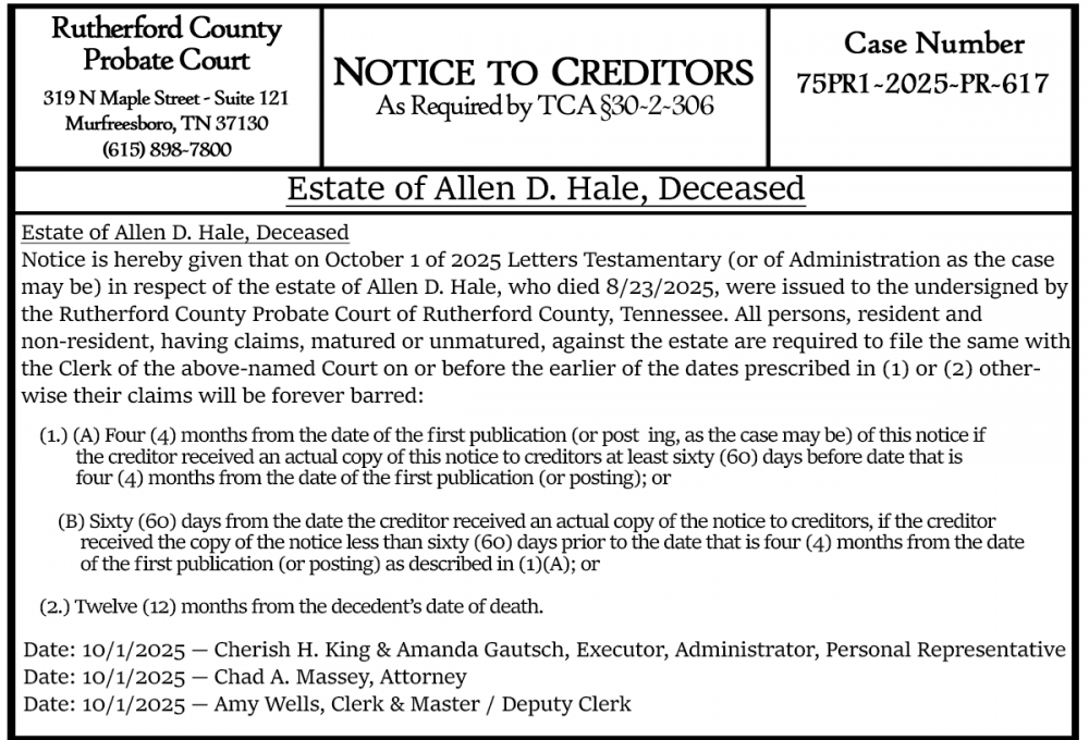 Notice is hereby given that on October 1 of 2025 Letters Testamentary (or of Administration as the case may be) in respect of the estate of Allen D. Hale, who died 8/23/2025, were issued to the undersigned by the Rutherford County Probate Court of Rutherford County, Tennessee. All persons, resident and non-resident, having claims, matured or unmatured, against the estate are required to file the same with the Clerk of the above-named Court on or before the earlier of the dates prescribed in (1) or (2) otherwise their claims will be forever barred: