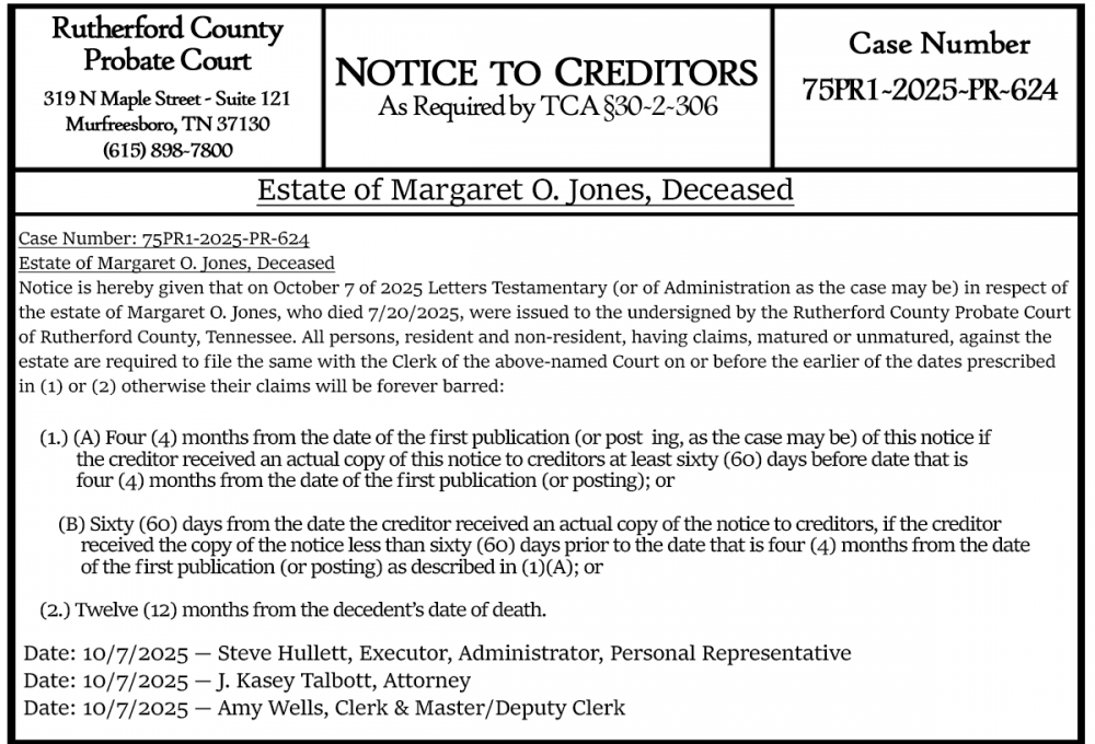 Notice is hereby given that on October 7 of 2025 Letters Testamentary (or of Administration as the case may be) in respect of the estate of Margaret O. Jones, who died 7/20/2025, were issued to the undersigned by the Rutherford County Probate Court of Rutherford County, Tennessee. All persons, resident and non-resident, having claims, matured or unmatured, against the estate are required to file the same with the Clerk of the above-named Court on or before the earlier of the dates prescribed in (1) or (2) otherwise their claims will be forever barred: