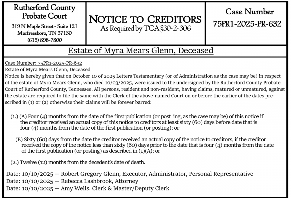Notice is hereby given that on October 10 of 2025 Letters Testamentary (or of Administration as the case may be) in respect of the estate of Myra Mears Glenn, who died 10/03/2025, were issued to the undersigned by the Rutherford County Probate Court of Rutherford County, Tennessee. All persons, resident and non-resident, having claims, matured or unmatured, against the estate are required to file the same with the Clerk of the above-named Court on or before the earlier of the dates prescribed in (1) or (2) otherwise their claims will be forever barred: