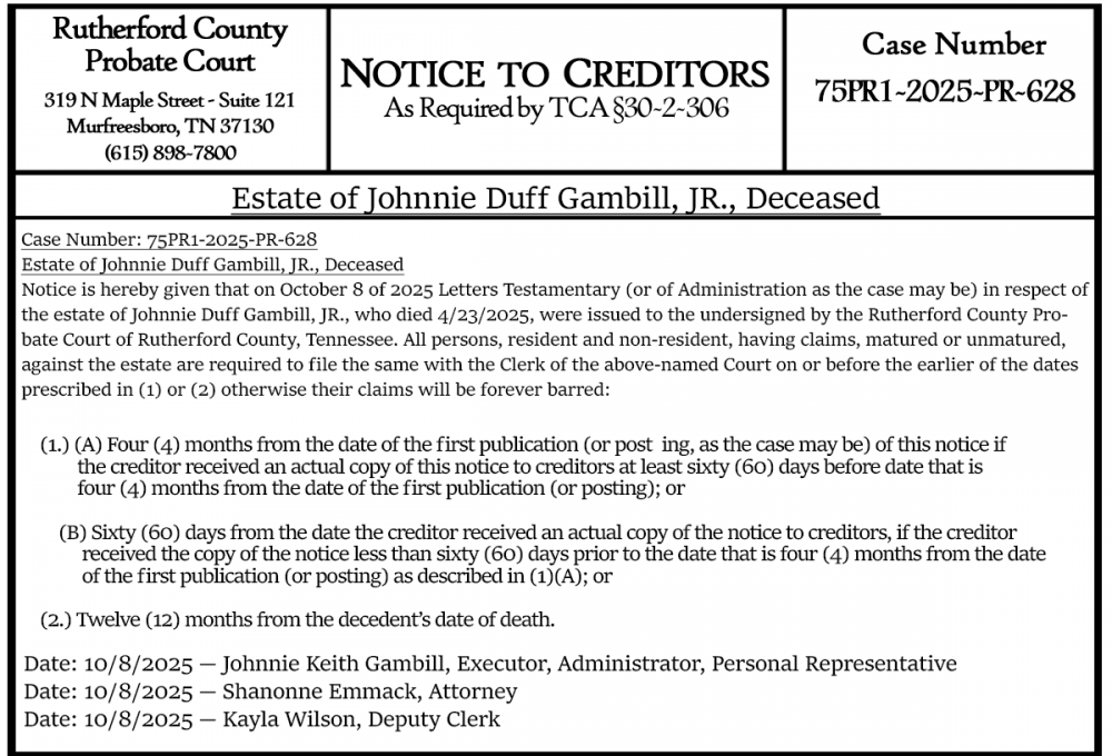 Notice is hereby given that on October 8 of 2025 Letters Testamentary (or of Administration as the case may be) in respect of the estate of Johnnie Duff Gambill, JR., who died 4/23/2025, were issued to the undersigned by the Rutherford County Probate Court of Rutherford County, Tennessee. All persons, resident and non-resident, having claims, matured or unmatured, against the estate are required to file the same with the Clerk of the above-named Court on or before the earlier of the dates prescribed in (1) or (2) otherwise their claims will be forever barred: