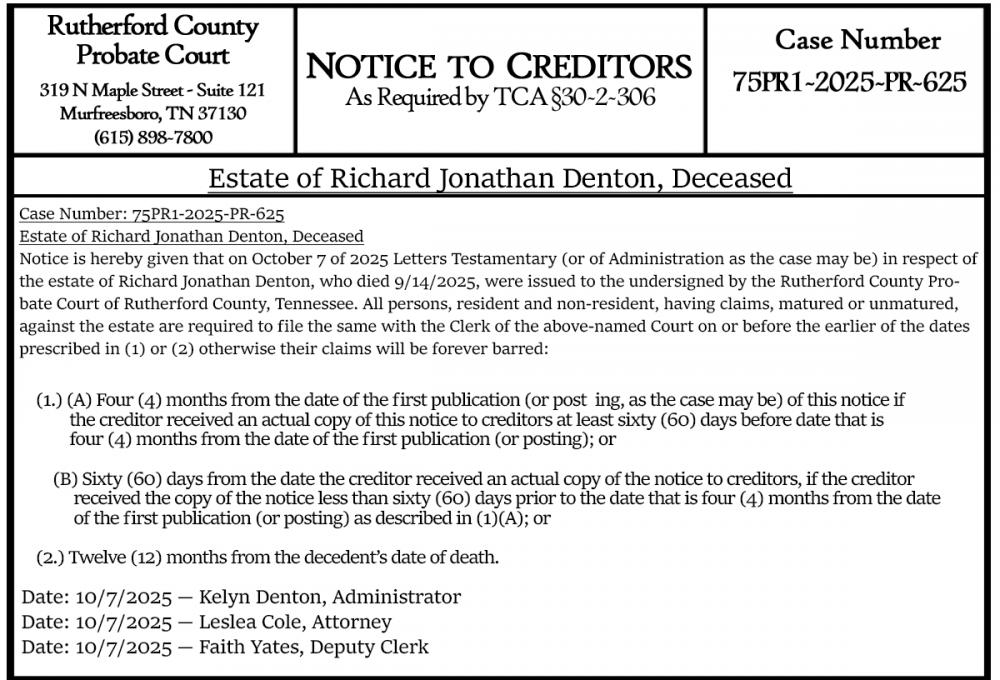 Notice is hereby given that on October 7 of 2025 Letters Testamentary (or of Administration as the case may be) in respect of the estate of Richard Jonathan Denton, who died 9/14/2025, were issued to the undersigned by the Rutherford County Probate Court of Rutherford County, Tennessee. All persons, resident and non-resident, having claims, matured or unmatured, against the estate are required to file the same with the Clerk of the above-named Court on or before the earlier of the dates prescribed in (1) or (2) otherwise their claims will be forever barred: