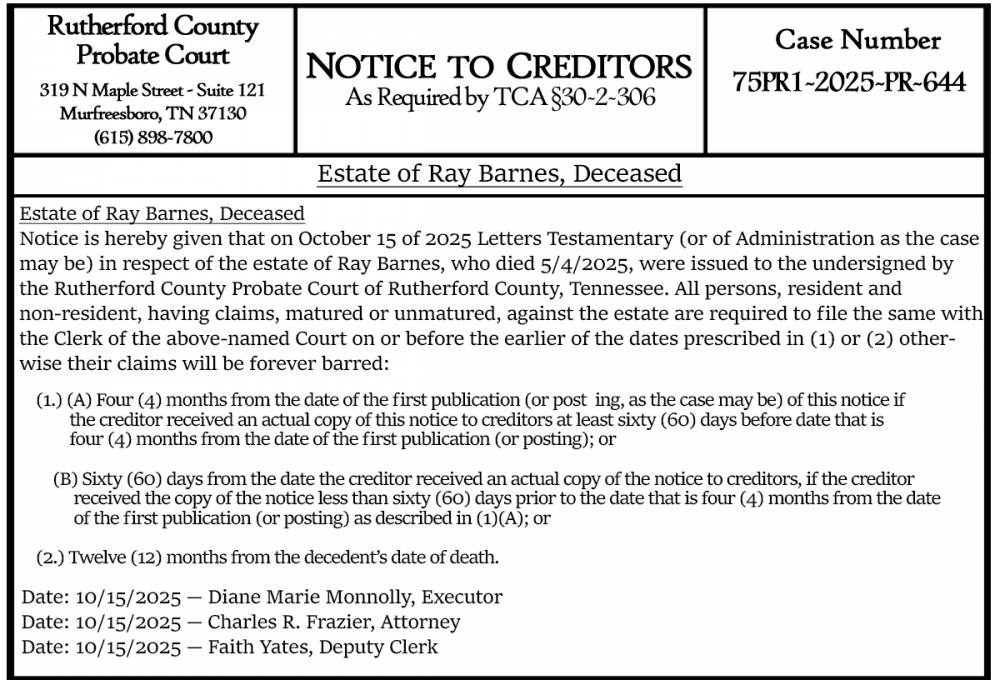 Notice is hereby given that on October 15 of 2025 Letters Testamentary (or of Administration as the case may be) in respect of the estate of Ray Barnes, who died 5/4/2025, were issued to the undersigned by the Rutherford County Probate Court of Rutherford County, Tennessee. All persons, resident and non-resident, having claims, matured or unmatured, against the estate are required to file the same with the Clerk of the above-named Court on or before the earlier of the dates prescribed in (1) or (2) otherwise their claims will be forever barred: