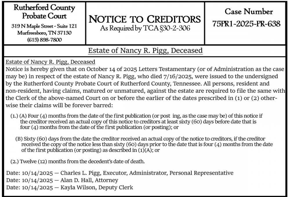 Notice is hereby given that on October 14 of 2025 Letters Testamentary (or of Administration as the case may be) in respect of the estate of Nancy R. Pigg, who died 7/16/2025, were issued to the undersigned by the Rutherford County Probate Court of Rutherford County, Tennessee. All persons, resident and non-resident, having claims, matured or unmatured, against the estate are required to file the same with the Clerk of the above-named Court on or before the earlier of the dates prescribed in (1) or (2) otherwise their claims will be forever barred: