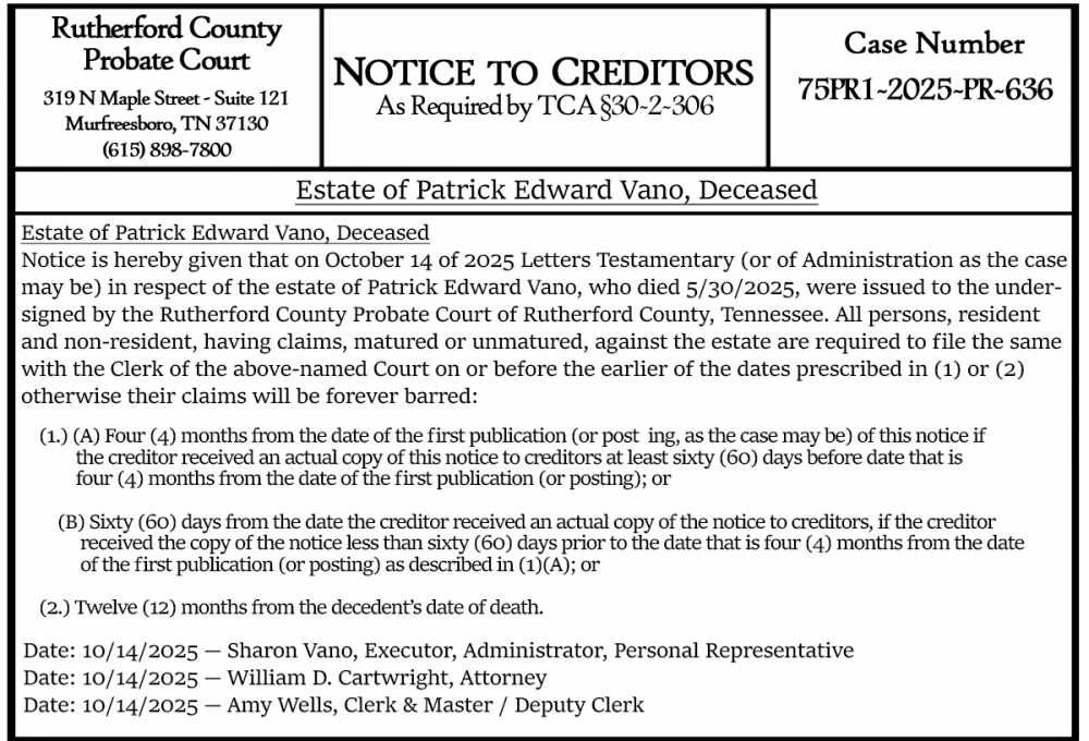 Notice is hereby given that on October 14 of 2025 Letters Testamentary (or of Administration as the case may be) in respect of the estate of Patrick Edward Vano, who died 5/30/2025, were issued to the undersigned by the Rutherford County Probate Court of Rutherford County, Tennessee. All persons, resident and non-resident, having claims, matured or unmatured, against the estate are required to file the same with the Clerk of the above-named Court on or before the earlier of the dates prescribed in (1) or (2) otherwise their claims will be forever barred: