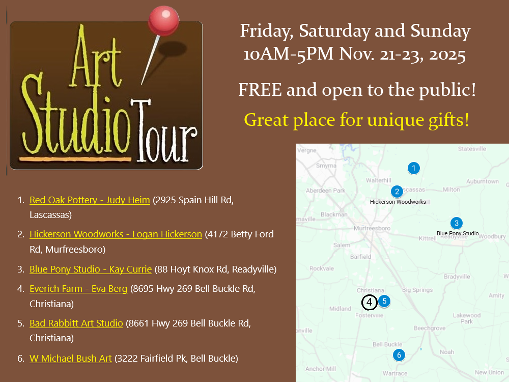 Fri, Sat, Sun (Nov. 21-23, 2025) 10AM-5PM Art Studio Tour's 32nd year with visits to 6 art studios across Rutherford County. Admission is FREE and it's an opportunity to meet the local artists, see their workspaces, and have the opportunity to purchase pottery, jewelry, fiber arts, wood working, paintings, mixed media, and more—and yes, they make unforgettable Christmas gifts!