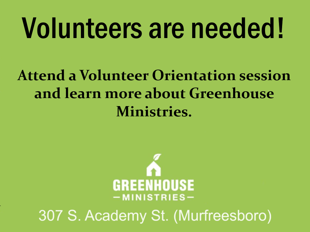 Greenhouse Ministries is at 307 S. Academy Street, Murfreesboro. For more information, phone (615) 494-0499.