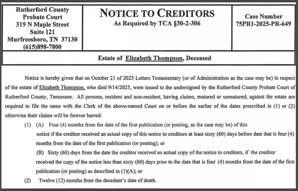 Notice is hereby given that on October 21 of 2025 Letters Testamentary (or of Administration as the case may be) in respect of the estate of Elizabeth Thompson, who died 9/14/2025, were issued to the undersigned by the Rutherford County Probate Court of Rutherford County, Tennessee. All persons, resident and non-resident, having claims, matured or unmatured, against the estate are required to file the same with the Clerk of the above-named Court on or before the earlier of the dates prescribed in (1) or (2) otherwise their claims will be forever barred: