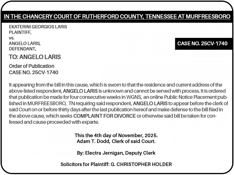 It appearing from the bill in this cause, which is sworn to that the residence and current address of the above-listed respondent, ANGELO LARIS is unknown and cannot be served with process. It is ordered that publication be made for four consecutive weeks in WGNS, an online Public Notice Placement published in MURFREESBORO, TN requiring said respondent, ANGELO LARIS to appear before the clerk of said Court on or before thirty days after the last publication hereof and make defense to the bill filed in the above cause, which seeks COMPLAINT FOR DIVORCE or otherwise said bill be taken for confessed and cause proceeded with exparte.