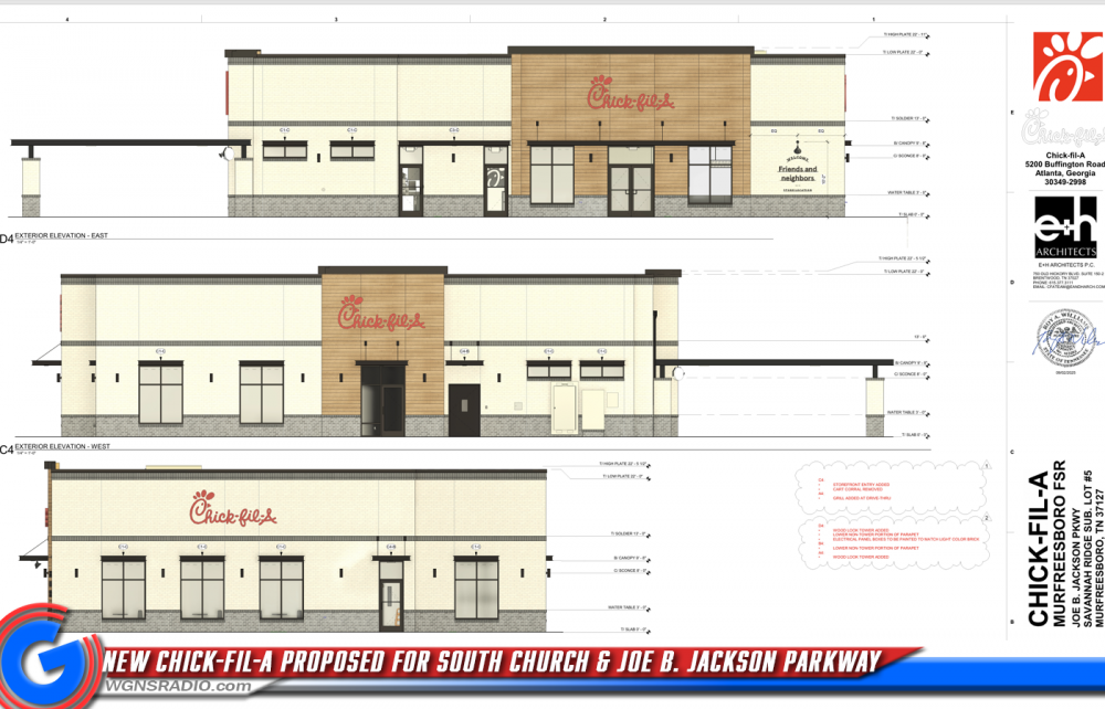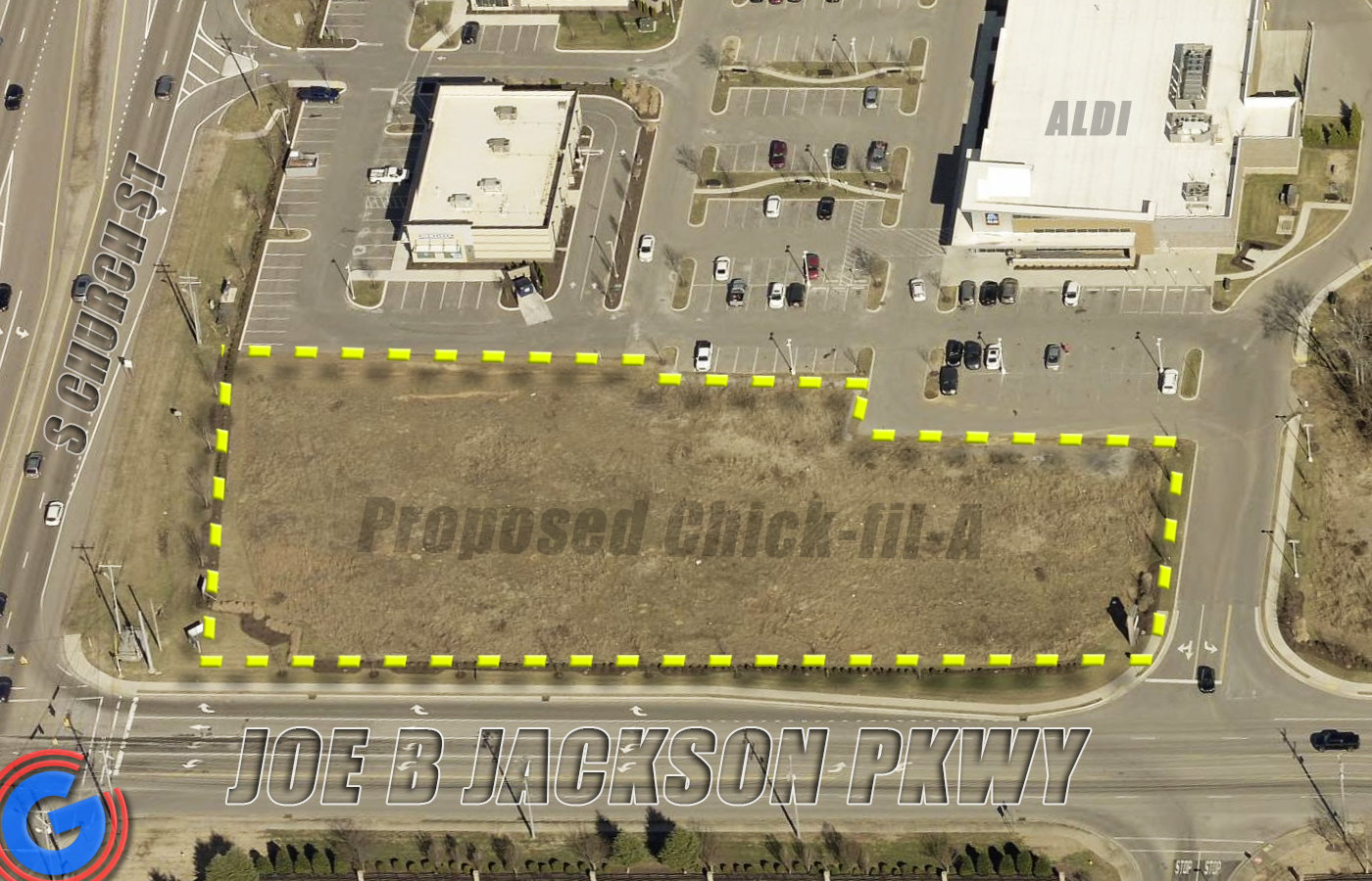 MURFREESBORO, TN - A new Chick-fil-A restaurant is being proposed for the northeast corner of South Church Street and Joe B. Jackson Parkway in Murfreesboro, directly across from Walmart and adjacent to the Aldi grocery store. The 5,183-square-foot, single-story building would feature a modern design, parking, landscaping, and a drive-thru, all within the Marketplace at Savannah Ridge development. The site plan shows that the restaurant would rely on existing shared access roads rather than adding new entrances to either major roadway.