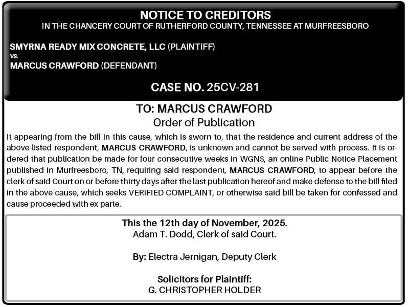 It appearing from the bill in this cause, which is sworn to, that the residence and current address of the above-listed respondent, MARCUS CRAWFORD, is unknown and cannot be served with process. It is ordered that publication be made for four consecutive weeks in WGNS, an online Public Notice Placement published in Murfreesboro, TN, requiring said respondent, MARCUS CRAWFORD, to appear before the clerk of said Court on or before thirty days after the last publication hereof and make defense to the bill filed in the above cause, which seeks VERIFIED COMPLAINT, or otherwise said bill be taken for confessed and cause proceeded with ex parte.