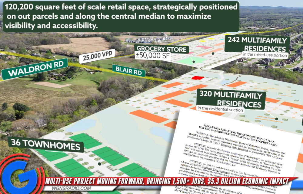 RUTHERFORD COUNTY, TN - A large-scale mixed-use development is moving forward after receiving support from both the Industrial Development Board and the Finance Committee of Rutherford County. The project won’t be located in Murfreesboro or Smyrna, but rather in La Vergne, in the northern part of the county. The Industrial Development Board authorized the 76.5-acre Waldron Station project, indicating a desire to adopt the plan and make it “financially feasible.” According to an economic impact report known as the Younger Study, the development is expected to create approximately 1,500 new jobs. Project details have since been submitted to the Rutherford County Commission for further consideration.