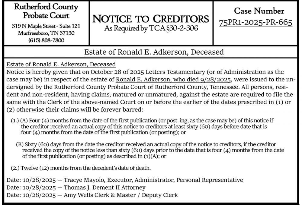 Notice is hereby given that on October 28 of 2025 Letters Testamentary (or of Administration as the case may be) in respect of the estate of Ronald E. Adkerson, who died 9/28/2025, were issued to the undersigned by the Rutherford County Probate Court of Rutherford County, Tennessee. All persons, resident and non-resident, having claims, matured or unmatured, against the estate are required to file the same with the Clerk of the above-named Court on or before the earlier of the dates prescribed in (1) or (2) otherwise their claims will be forever barred:
