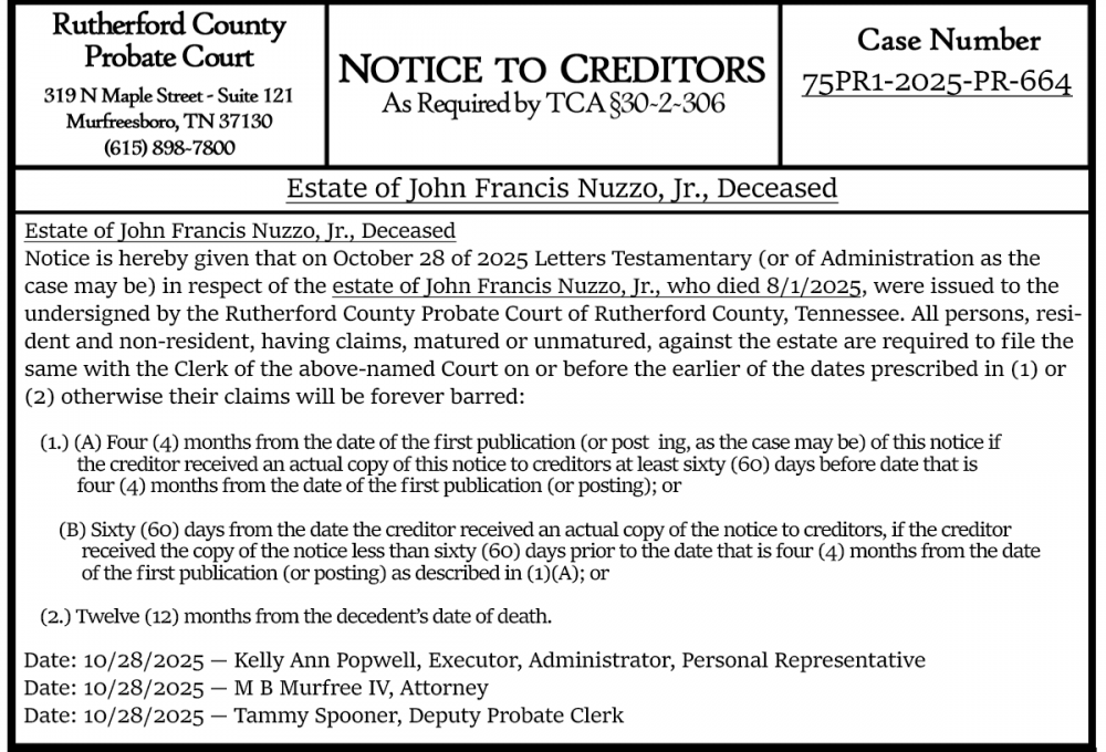 Notice is hereby given that on October 28 of 2025 Letters Testamentary (or of Administration as the case may be) in respect of the estate of John Francis Nuzzo, Jr., who died 8/1/2025, were issued to the undersigned by the Rutherford County Probate Court of Rutherford County, Tennessee. All persons, resident and non-resident, having claims, matured or unmatured, against the estate are required to file the same with the Clerk of the above-named Court on or before the earlier of the dates prescribed in (1) or (2) otherwise their claims will be forever barred: