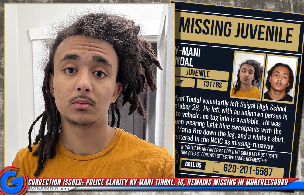 UPDATED: MURFREESBORO, Tenn. – Murfreesboro Police released an update Tuesday afternoon (11/18/2025) regarding the search for a missing teenager, but shortly after, the department corrected its initial statement the following morning (Wednesday, 11/19/2025). Police initially notified local media that the missing teen had been found safe. However, after further review, MPD re-contacted WGNS and issued a clarification, stating: “CORRECTION… Juvenile Ky-Mani Tindal is still missing. There was miscommunication that the teen had been located.”
