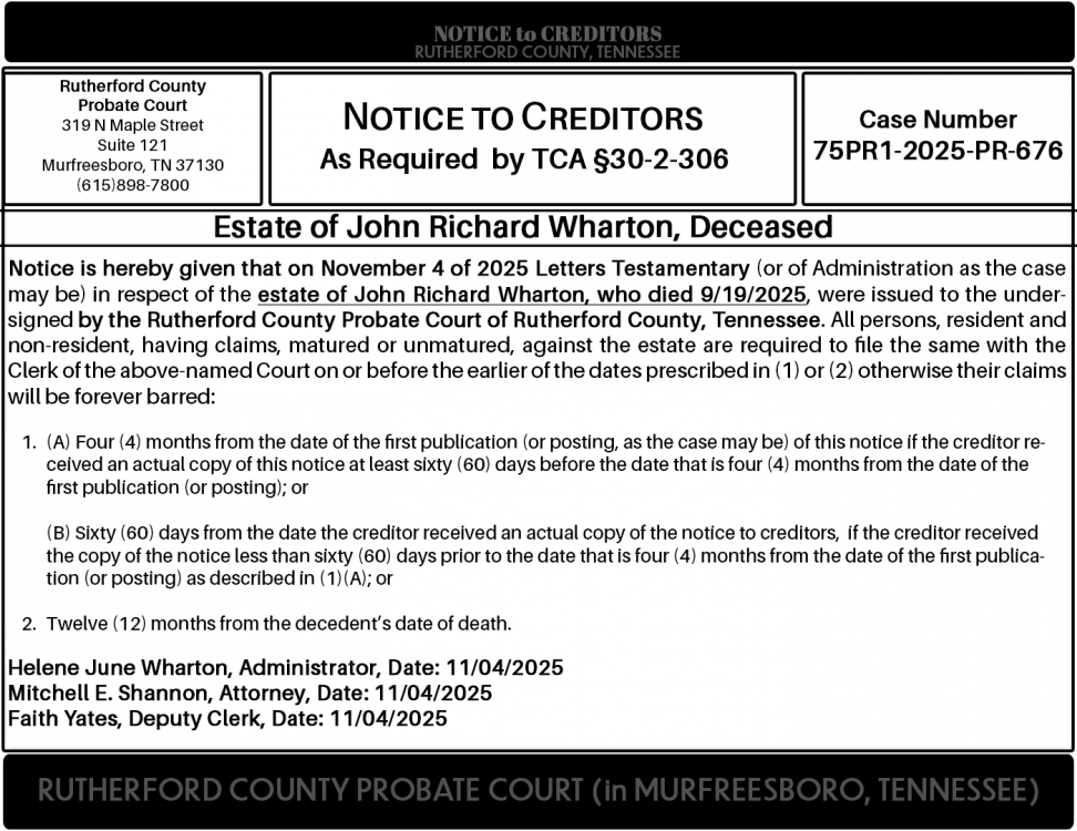 Notice is hereby given that on November 4 of 2025 Letters Testamentary (or of Administration as the case may be) in respect of the estate of John Richard Wharton, who died 9/19/2025, were issued to the undersigned by the Rutherford County Probate Court of Rutherford County, Tennessee. All persons, resident and non-resident, having claims, matured or unmatured, against the estate are required to file the same with the Clerk of the above-named Court on or before the earlier of the dates prescribed in (1) or (2) otherwise their claims will be forever barred: