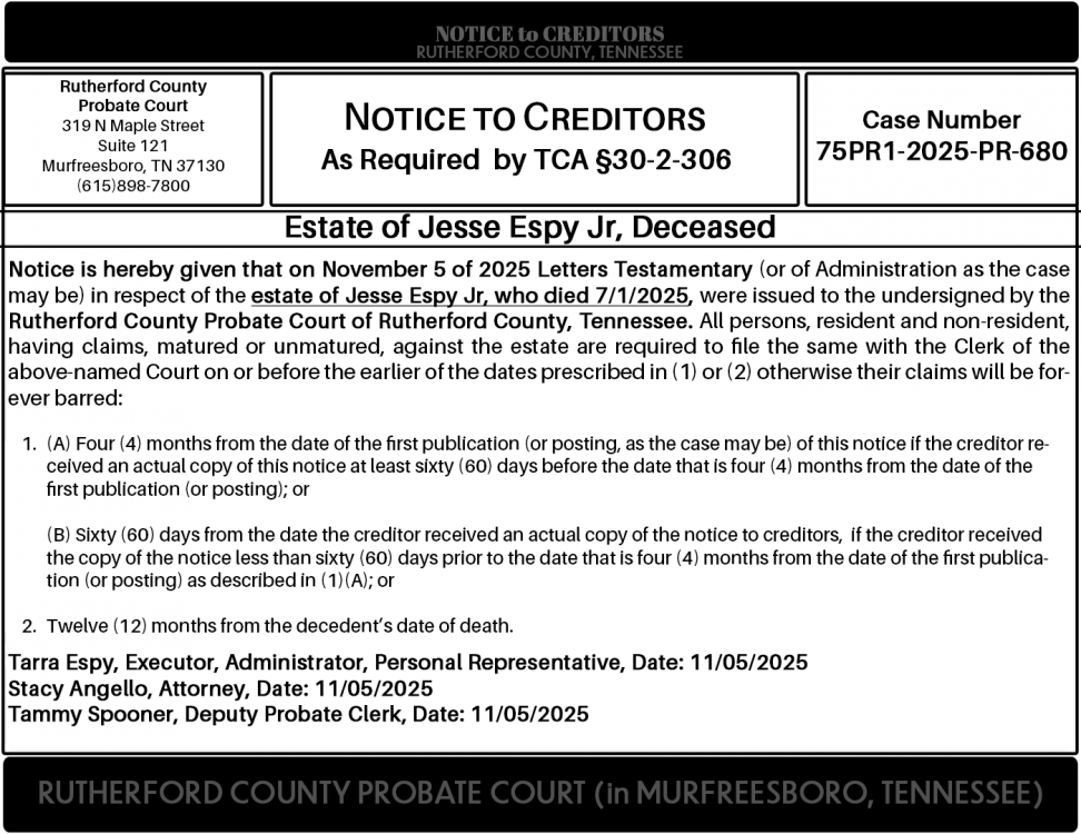 Notice is hereby given that on November 5 of 2025 Letters Testamentary (or of Administration as the case may be) in respect of the estate of Jesse Espy Jr, who died 7/1/2025, were issued to the undersigned by the Rutherford County Probate Court of Rutherford County, Tennessee. All persons, resident and non-resident, having claims, matured or unmatured, against the estate are required to file the same with the Clerk of the above-named Court on or before the earlier of the dates prescribed in (1) or (2) otherwise their claims will be forever barred: