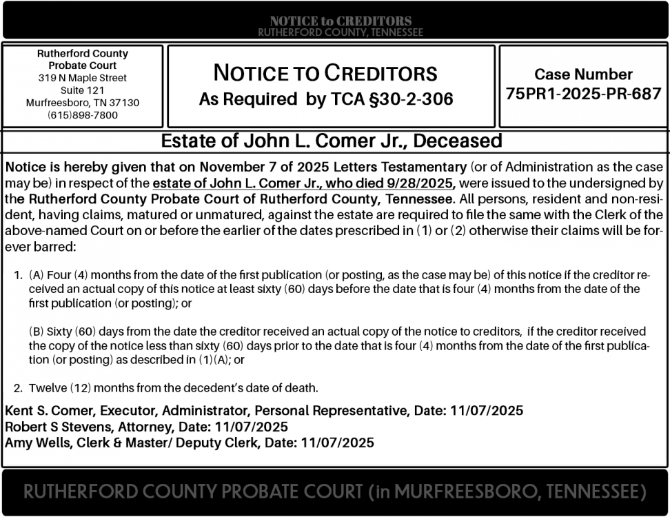 Notice is hereby given that on November 7 of 2025 Letters Testamentary (or of Administration as the case may be) in respect of the estate of John L. Comer Jr., who died 9/28/2025, were issued to the undersigned by the Rutherford County Probate Court of Rutherford County, Tennessee. All persons, resident and non-resident, having claims, matured or unmatured, against the estate are required to file the same with the Clerk of the above-named Court on or before the earlier of the dates prescribed in (1) or (2) otherwise their claims will be forever barred:
