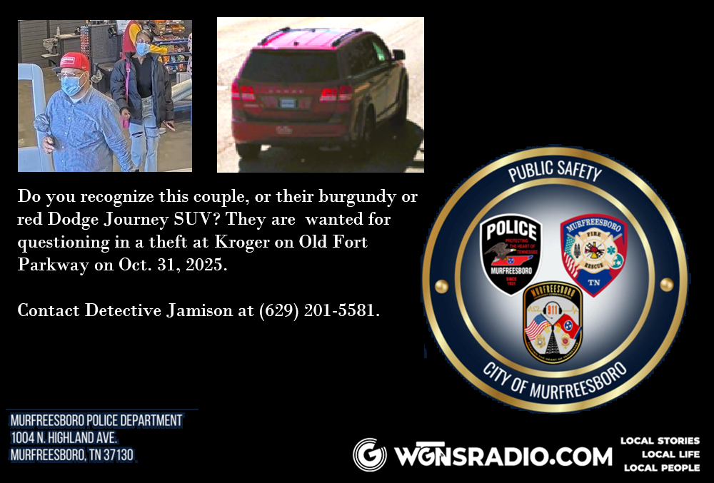 MURFREESBORO, TN - Murfreesboro police are asking for help identifying a man and woman wanted for questioning after a theft at Kroger on Old Fort Parkway. Investigators say the incident happened on October 31, 2025, when a woman distracted a shopper while her partner stole the victim’s wallet from her purse. That wallet was later used at Lowe’s, also on Old Fort Parkway, where fraudulent purchases were made.