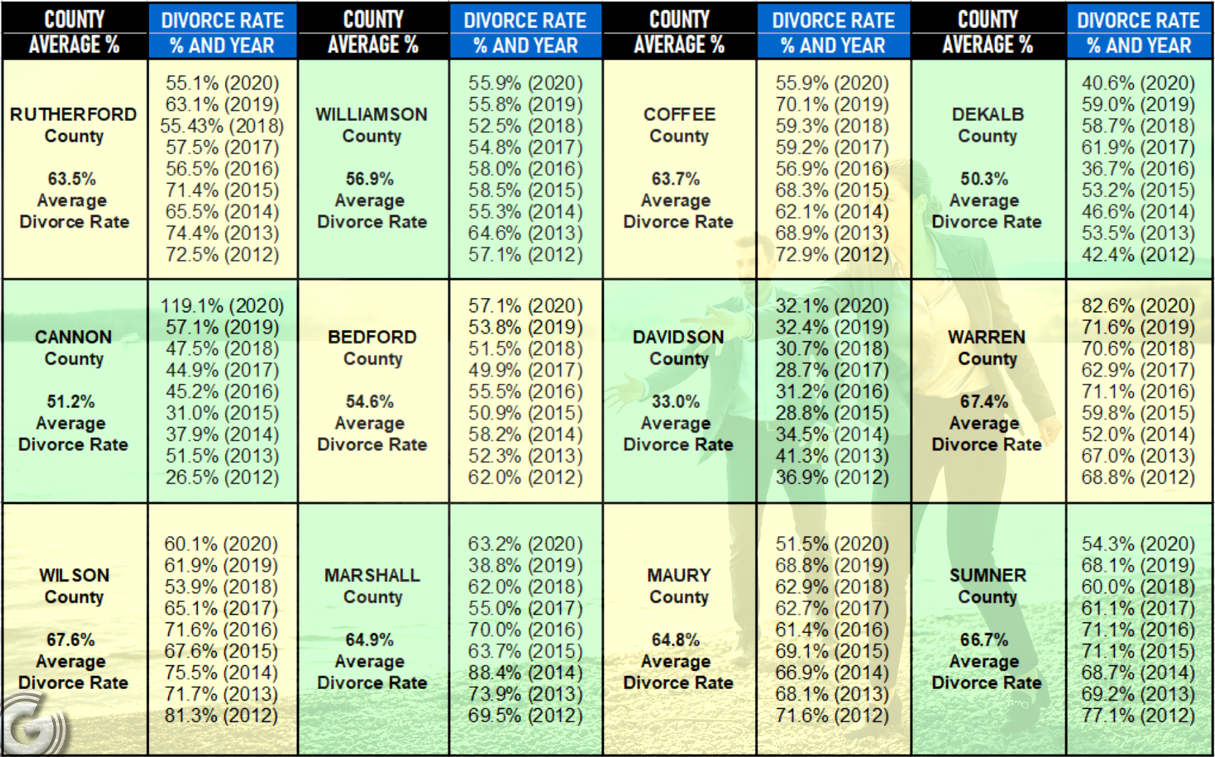 - Every county within 18 miles of downtown Murfreesboro shows divorce averages well above state norms—except Davidson County.