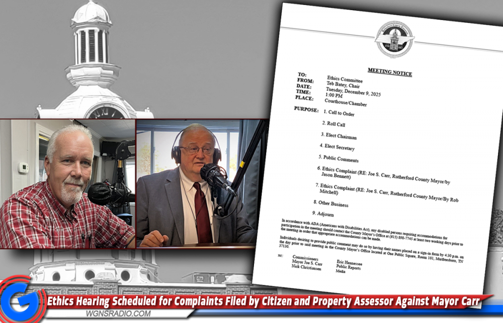 MURFREESBORO, Tenn. — The Rutherford County Ethics Committee is scheduled to meet Tuesday, December 9, at 1:00 p.m. at the Courthouse/Chamber to address multiple ethics-related matters, including two formal complaints filed against Rutherford County Mayor Joe S. Carr.