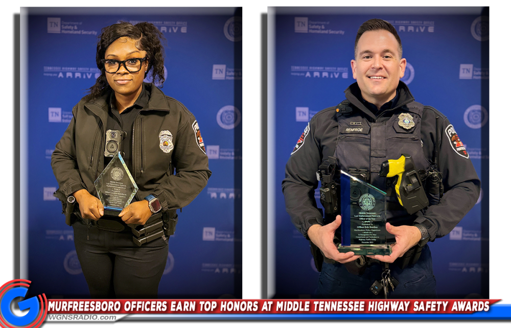 BELL BUCKLE, Tenn. — Two Murfreesboro Police Department (MPD) traffic officers received top honors at the Tennessee Highway Safety Office’s (THSO) Middle Tennessee Holiday Network Meeting on Dec. 10, held in Bell Buckle. Officer Eric Renfroe was named Region 3 Officer of the Year for his proactive work with the MPD Traffic Unit. Renfroe serves as the lead investigator for the Fatal Accident Crash Team (FACT) and is recognized as a dedicated member who routinely assists fellow officers with complex cases.