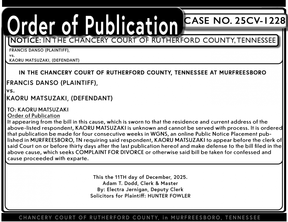 It appearing from the bill in this cause, which is sworn to that the residence and current address of the above-listed respondent, KAORU MATSUZAKI is unknown and cannot be served with process. It is ordered that publication be made for four consecutive weeks in WGNS, an online Public Notice Placement published in MURFREESBORO, TN requiring said respondent, KAORU MATSUZAKI to appear before the clerk of said Court on or before thirty days after the last publication hereof and make defense to the bill filed in the above cause, which seeks COMPLAINT FOR DIVORCE or otherwise said bill be taken for confessed and cause proceeded with exparte.