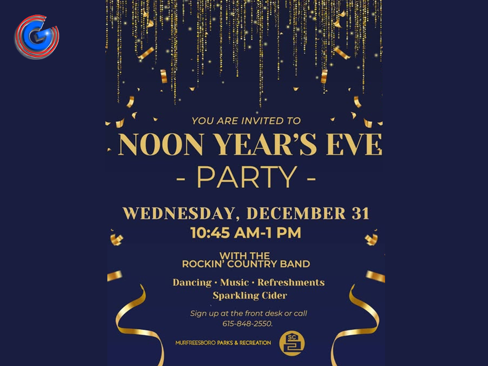 Wed. (Dec. 31, 2025) 11:45AM - 1:00PM Enjoy a free NOON YEAR'S EVE party and dance for persons age 60+ at the St. Clair Senior Center, 325 St. Clair, Murfreesboro. Enjoy the Rockin' Country Band, dancing, music, refreshments, and sparkling cider. Sign-up at the front desk or phone (615) 848-2550.