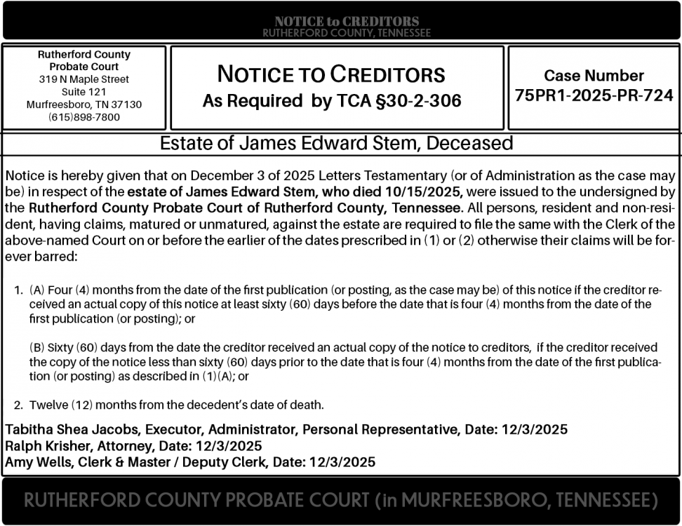 Notice is hereby given that on December 3 of 2025 Letters Testamentary (or of Administration as the case may be) in respect of the estate of James Edward Stem, who died 10/15/2025, were issued to the undersigned by the Rutherford County Probate Court of Rutherford County, Tennessee. All persons, resident and non-resident, having claims, matured or unmatured, against the estate are required to file the same with the Clerk of the above-named Court on or before the earlier of the dates prescribed in (1) or (2) otherwise their claims will be forever barred: