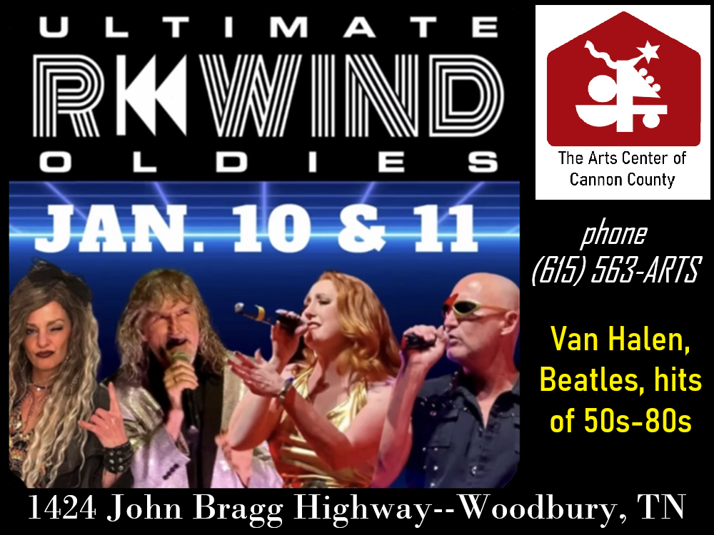 Sat. 7:30PM / Sun. 2PM (Jan. 10 - 11, 2026) "Live" Tribute Rewind concert with hits by the Beatles, Van Halen, 50s, 60s, 70s, and 80s at the Arts Center of Cannon County (1424 John Bragg Highway in neighboring Woodbury, TN). For more information, or to purchase tickets--phone (615) 563-arts (2787).
