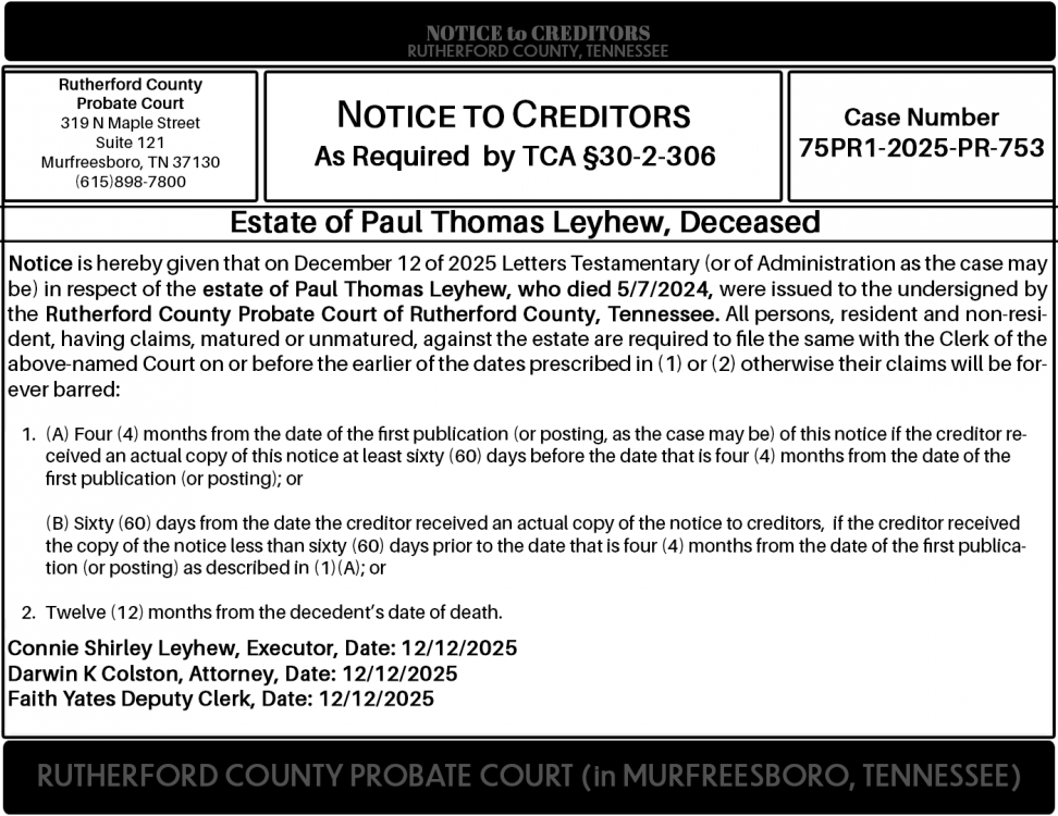 Notice is hereby given that on December 12 of 2025 Letters Testamentary (or of Administration as the case may be) in respect of the estate of Paul Thomas Leyhew, who died 5/7/2024, were issued to the undersigned by the Rutherford County Probate Court of Rutherford County, Tennessee. All persons, resident and non-resident, having claims, matured or unmatured, against the estate are required to file the same with the Clerk of the above-named Court on or before the earlier of the dates prescribed in (1) or (2) otherwise their claims will be forever barred: