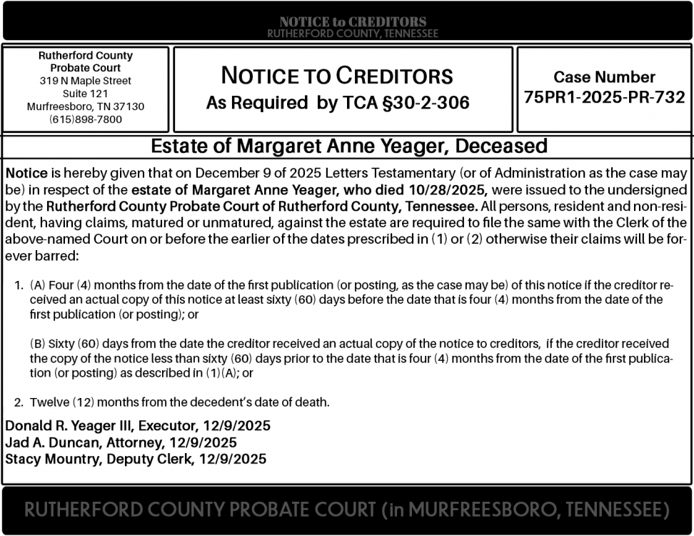 Notice is hereby given that on December 9 of 2025 Letters Testamentary (or of Administration as the case may be) in respect of the estate of Margaret Anne Yeager, who died 10/28/2025, were issued to the undersigned by the Rutherford County Probate Court of Rutherford County, Tennessee. All persons, resident and non-resident, having claims, matured or unmatured, against the estate are required to file the same with the Clerk of the above-named Court on or before the earlier of the dates prescribed in (1) or (2) otherwise their claims will be forever barred: