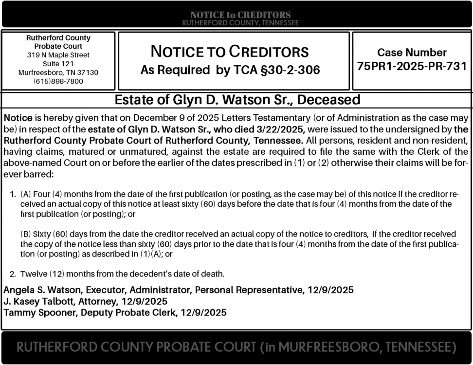 Notice is hereby given that on December 9 of 2025 Letters Testamentary (or of Administration as the case may be) in respect of the estate of Glyn D. Watson Sr., who died 3/22/2025, were issued to the undersigned by the Rutherford County Probate Court of Rutherford County, Tennessee. All persons, resident and non-resident, having claims, matured or unmatured, against the estate are required to file the same with the Clerk of the above-named Court on or before the earlier of the dates prescribed in (1) or (2) otherwise their claims will be forever barred: