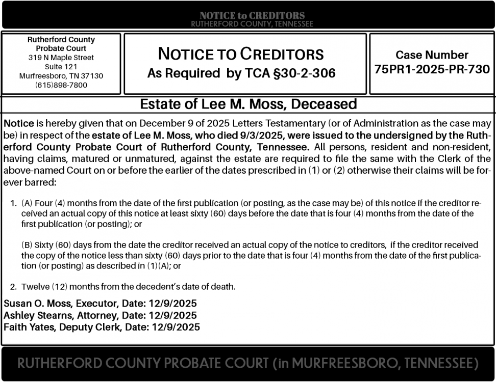 Notice is hereby given that on December 9 of 2025 Letters Testamentary (or of Administration as the case may be) in respect of the estate of Lee M. Moss, who died 9/3/2025, were issued to the undersigned by the Rutherford County Probate Court of Rutherford County, Tennessee. All persons, resident and non-resident, having claims, matured or unmatured, against the estate are required to file the same with the Clerk of the above-named Court on or before the earlier of the dates prescribed in (1) or (2) otherwise their claims will be forever barred: