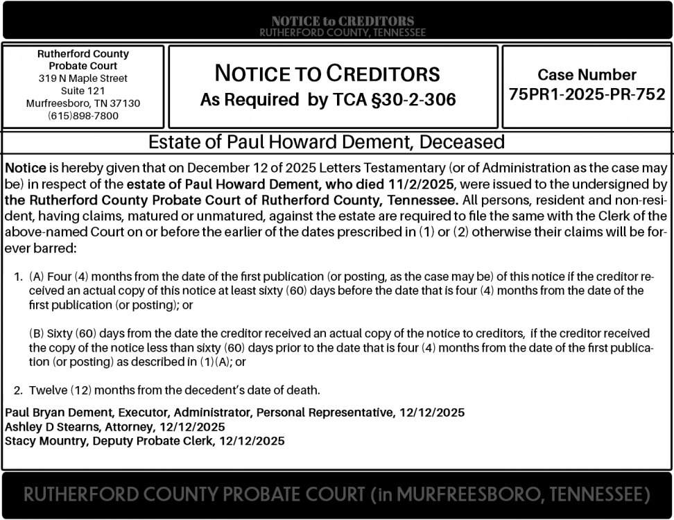 Notice is hereby given that on December 12 of 2025 Letters Testamentary (or of Administration as the case may be) in respect of the estate of Paul Howard Dement, who died 11/2/2025, were issued to the undersigned by the Rutherford County Probate Court of Rutherford County, Tennessee. All persons, resident and non-resident, having claims, matured or unmatured, against the estate are required to file the same with the Clerk of the above-named Court on or before the earlier of the dates prescribed in (1) or (2) otherwise their claims will be forever barred: