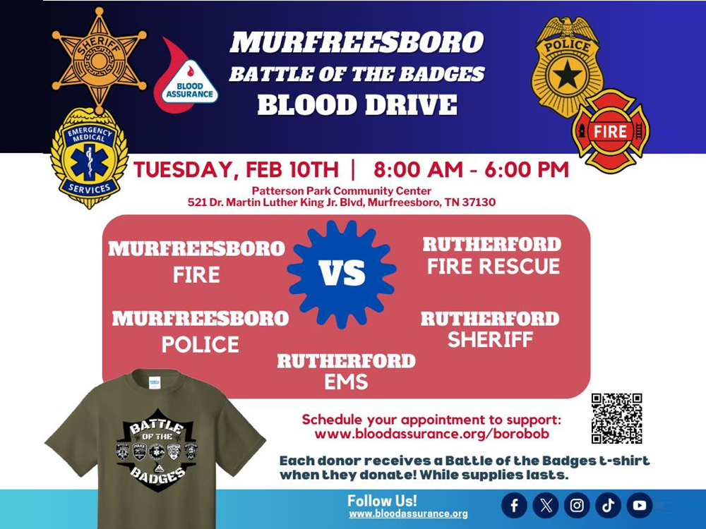 Tue. (Feb. 10, 2026) 8AM-6PM BATTLE OF THE BADGES BLOOD DRIVE at the Patterson Community Center, 521 Dr. Martin Luther King, Jr. Blvd, Murfreesboro. This is a friendly competition BLOOD DRIVE between Murfreesboro Fire-Rescue, Murfreesboro Police, Rutherford County Sheriffs, Rutherford County Fire-Rescue, Rutherford County Emergency Medical Service. This event is open to the public — friends & family are welcome! Just make sure you let them blood drive specialists when you arrive know where you want your points to go. Sign up to donate: www.bloodassurance.org/borobob (or scan the QR code on the flyer!). Double points for Double Reds or Plasma donations! All donors receive a BOB T-shirt!