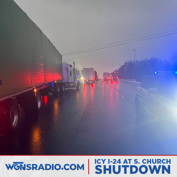 MURFREESBORO, Tenn. (WGNS) - 5:45pm Report - Icy roads have brought traffic to a standstill on Interstate 24 toward Nashville this afternoon. Officials have completely shut down the westbound lanes just before the South Church Street exit due to dangerous ice accumulation.