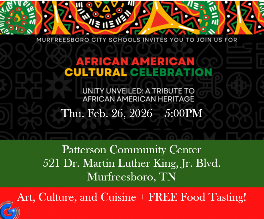 Thu. (Feb. 26, 2026) 5-7PM AFRICAN AMERICAN CULTURAL CELEBRATION at the Patterson Community Center (521 Dr. MLK, Jr. Blvd., Murfreesboro). The Murfreesboro City Schools and Patterson Park Community Center celebrate this community's diversity through art, cuisine, history, and music. The celebration will include performances beginning at 6 p.m. with live music and dramatic interpretations. Admission is FREE!