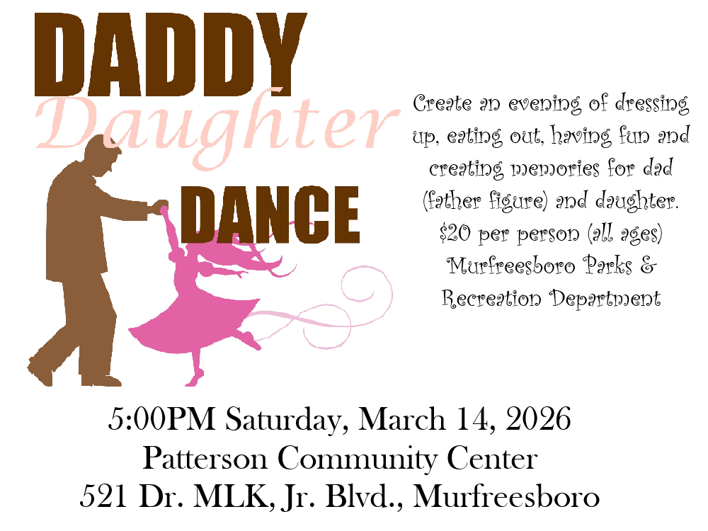 Sat. (March 14, 2026) 5:00PM Daddy-Daughter Dance at the Patterson Community Center (521 Dr. Martin Luther King, Jr. Blvd., Murfreesboro). Enjoy and evening of music, fun and dancing for dads and daughters to create lasting memories. This is an opportunity for dads (father figures) and daughters to dress up and come out and eat, dance, and have fun while creating lasting memories. Registration available at Patterson Park Community Center, Sports*Com, McFadden Community Center, and Murfreesboro Parks & Recreation Department's Main Office or online at the link. Phone 615-893-1802. Cost: $20/person (all ages). CLICK HERE to register on-line.