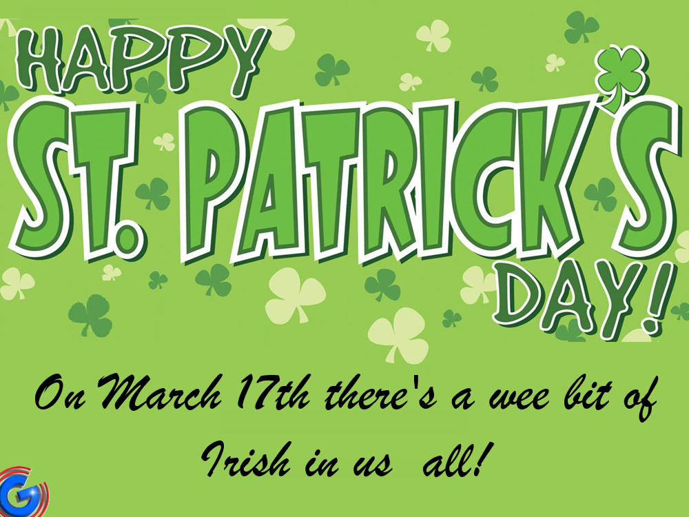 Tue. (March 17, 2026) all day: ST. PATRICK'S DAY--enjoy yourself, there's a wee bit of Irish in us all on this day!