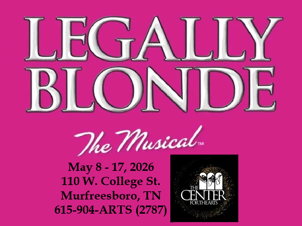 Fri-Sat 7:30PM / Sat-Sun 2PM (May 8-17, 2026) The Center for the Arts (110 W. College St., Murfreesboro) invites you to attend the production of “Legally Blonde”. Legally Blonde follows Elle Woods, a fashion-loving sorority president who enrolls at Harvard Law School to win back her ex-boyfriend. Along the way, she discovers her own intelligence, resilience, and sense of purpose—proving that she’s far more than people assume. The story celebrates confidence, hard work, and the power of staying true to yourself even when others underestimate you. Tickets available on-line at http://boroarts.org or phone (615) 563-ARTS (2787) for information. Also, make it a point to walk through the gallery for the show that changes monthly. Admission is free to the gallery.