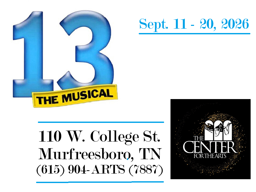 Fri-Sat 7:30PM / Sat-Sun 2PM (Sept. 11-20, 2026) The Center for the Arts (110 W. College St., Murfreesboro) invites you to attend the production of “13, The Musical”. 13, The Musical follows Evan Goldman, a New York City kid whose life is upended when his parents’ divorce and he’s forced to move to a small town in Indiana just before his bar mitzvah. Determined to make new friends fast, he gets tangled in middle‑school drama, crushes, and shifting loyalties as he tries to plan the perfect party. The story captures the awkward, funny, and heartfelt journey of figuring out who you are when everything around you is changing. Tickets available on-line at http://boroarts.org or phone (615) 563-ARTS (2787) for information. Also, make it a point to walk through the gallery for the show that changes monthly. Admission is free to the gallery.